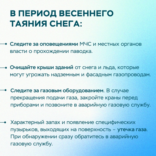 В рамках противопаводковых мероприятий создан реестр газопроводов в зонах возможного подтопления. Специалисты проводят постоянный мониторинг объектов газораспределения, при необходимости откачивают талые воды из газовых колодцев. Подготовлены планы дополнительных подъездных путей для обеспечения аварийно-восстановительных работ.