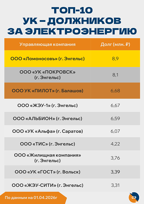 Специалисты ПАО «Саратовэнерго» определили ТОП-10 управляющих компаний – должников за электроэнергию по состоянию на 1 апреля текущего года. Совокупная задолженность 56 управляющих организаций – должников с действующими договорами составляет более 159 миллионов рублей. В ТОП-10 вошли семь исполнителей коммунальных услуг из Энгельса и по одной из Саратова, Вольска и Балашова.